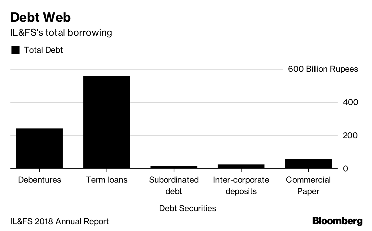 IL&FS group, which had total debt of $12.6 billion as of March 31, hasn’t been able to pay more than 4.9 billion rupees of its obligations this year. Sixty-one percent of its borrowings are in the form of loans from financial institutions. –Bloomberg