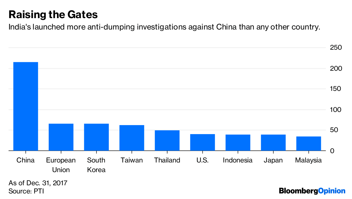 For many here, that wouldn’t be a tragedy. And, frankly, even free-traders like myself see their point. India’s goods trade deficit with China appears unsustainable: It was $63 billion in 2017-18, up from $51 billion in the previous financial year and $16 billion ten years ago. That’s 60 per cent of India’s overall trade deficit. As far as Indian policymakers are concerned, much of what’s being imported is sub-standard or otherwise fair game for anti-dumping legislation. China’s the main target of Indian anti-dumping action, with 214 separate investigations opened — and, even so, Indian legislators are worried that the measures are ineffective.