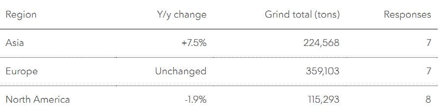Bean grindings in Asia probably climbed 7.5% in the fourth quarter from a year earlier, rounding out an annual record, according to the median response in a survey of analysts, brokers and grinders. Processing likely held steady in Europe, the top consuming region, and declined in North America.