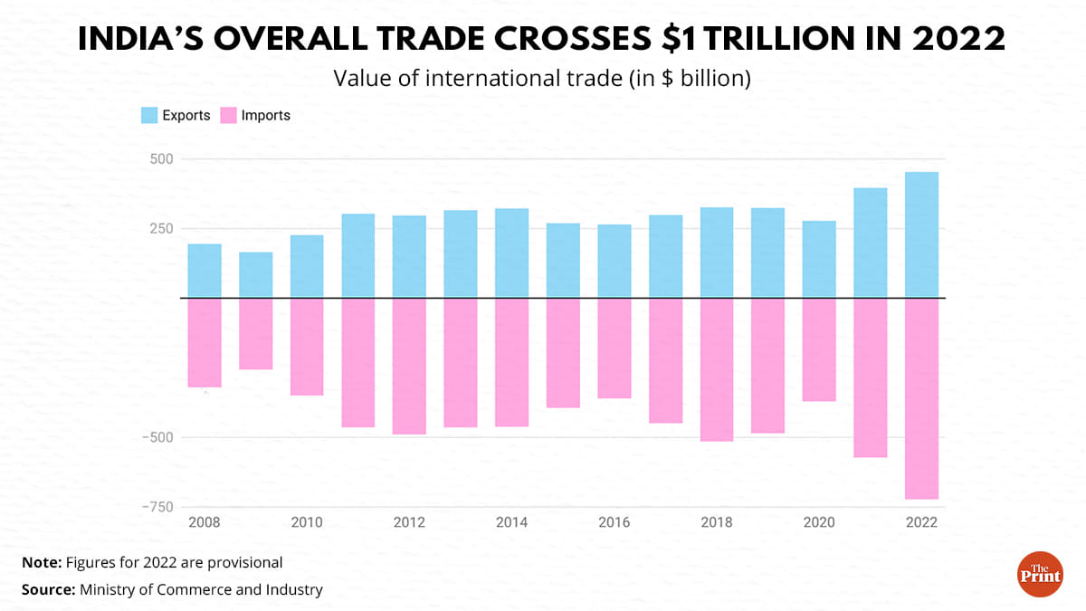 New Delhi: India’s international trade crossed the $1 trillion mark for the first time in the year ending December 2022. However, data from the Ministry of Commerce and Industry show that this has come with a record high trade deficit — over $85 billion — with China.