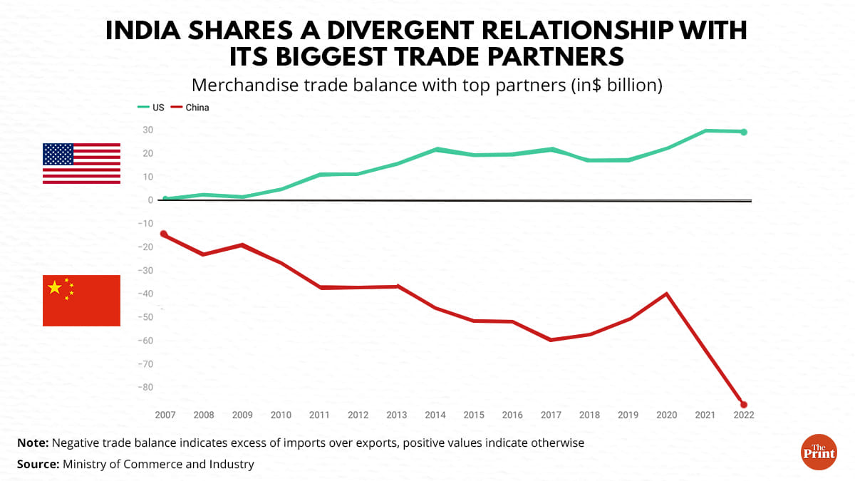 A key difference between these two countries, however, is that India runs a huge trade deficit with China and a surplus with the US.