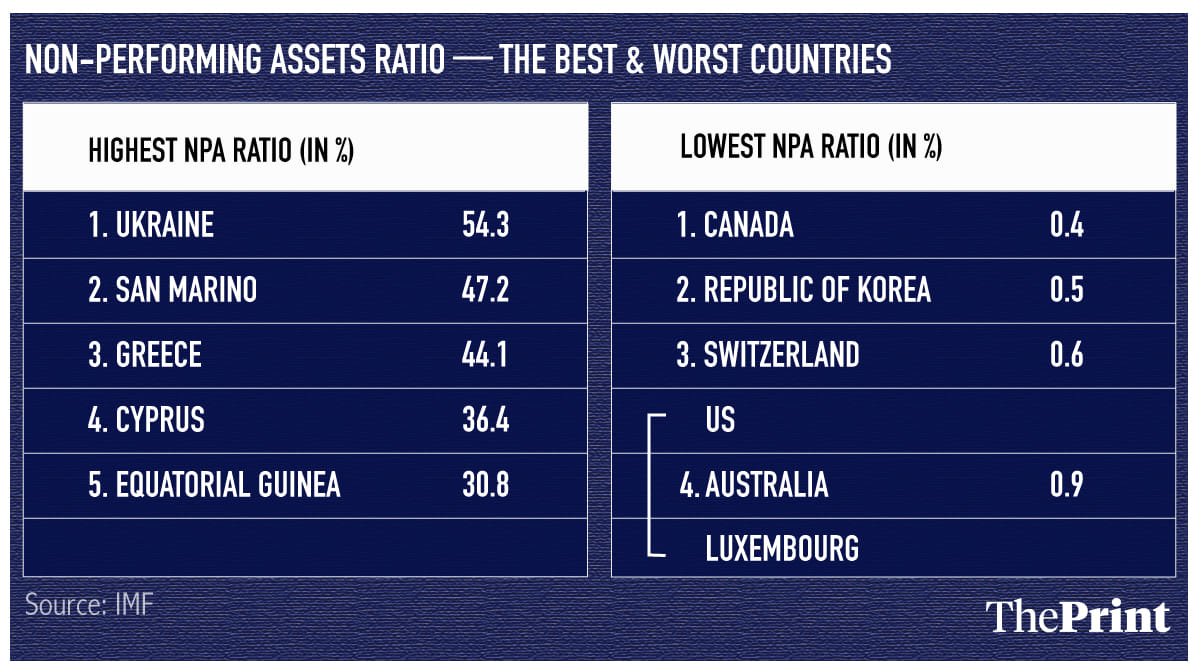 The lowest NPA ratio has been reported by Canada at 0.4 per cent, followed by South Korea at 0.5 per cent and Switzerland at 0.6 per cent.