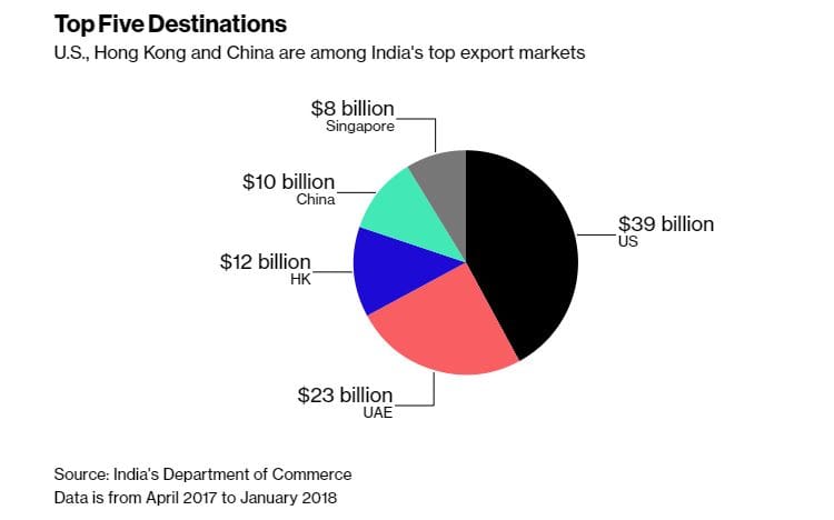 This goes against the argument that India is relatively insulated from a trade war, given its low share of total world exports of just 1.7 percent. President Donald Trump has threatened tariffs on $150 billion of Chinese imports in retaliation for alleged violations of intellectual property rights, while Beijing has vowed to retaliate on everything from American soybeans to planes.