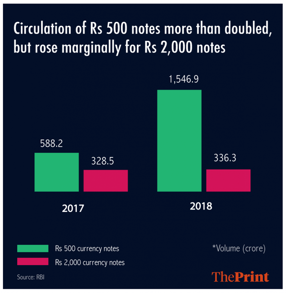 In contrast, the printing and circulation of the new Rs 500 note has been stepped up. India added 958.7 crore Rs 500 notes in 2017-18, with 588.2 crore notes in circulation the previous year.