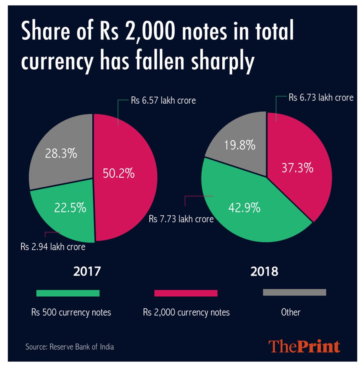 As of March 2018, the total value of the currency in circulation was Rs 18.03 lakh crore, of which Rs 6.73 lakh crore, or 37 per cent, was in Rs 2,000 notes, and Rs 7.73 lakh crore, approximately 43 per cent, in Rs 500 notes. The remaining was in the lower denominations.