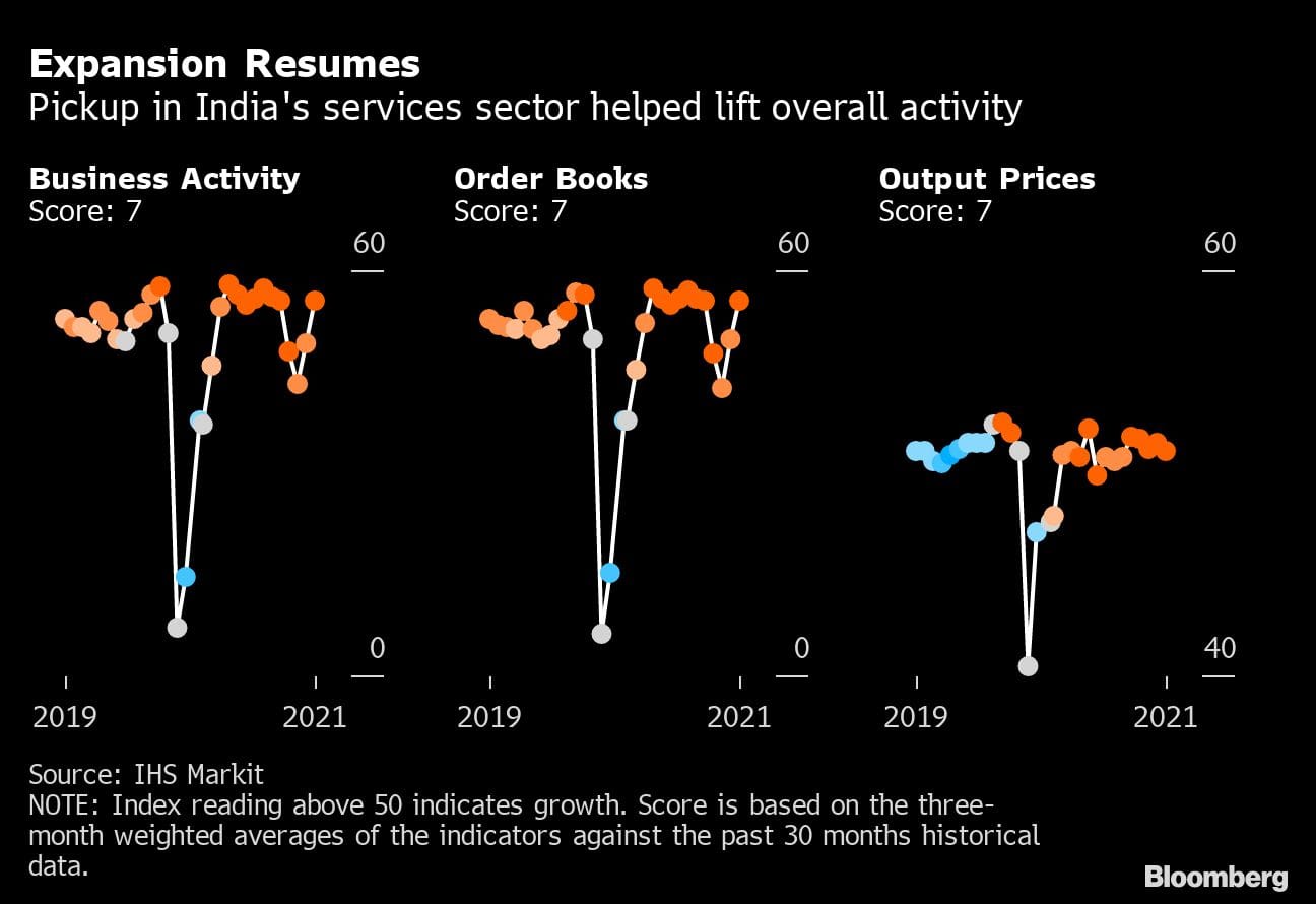 Factory managers in India reported growth in new orders last month, helping businesses retain their optimistic growth projections. A similar survey of services’ purchasing managers showed the return of business confidence amid easing virus curbs. That catapulted the composite index to expansion territory for the first time in four months.
