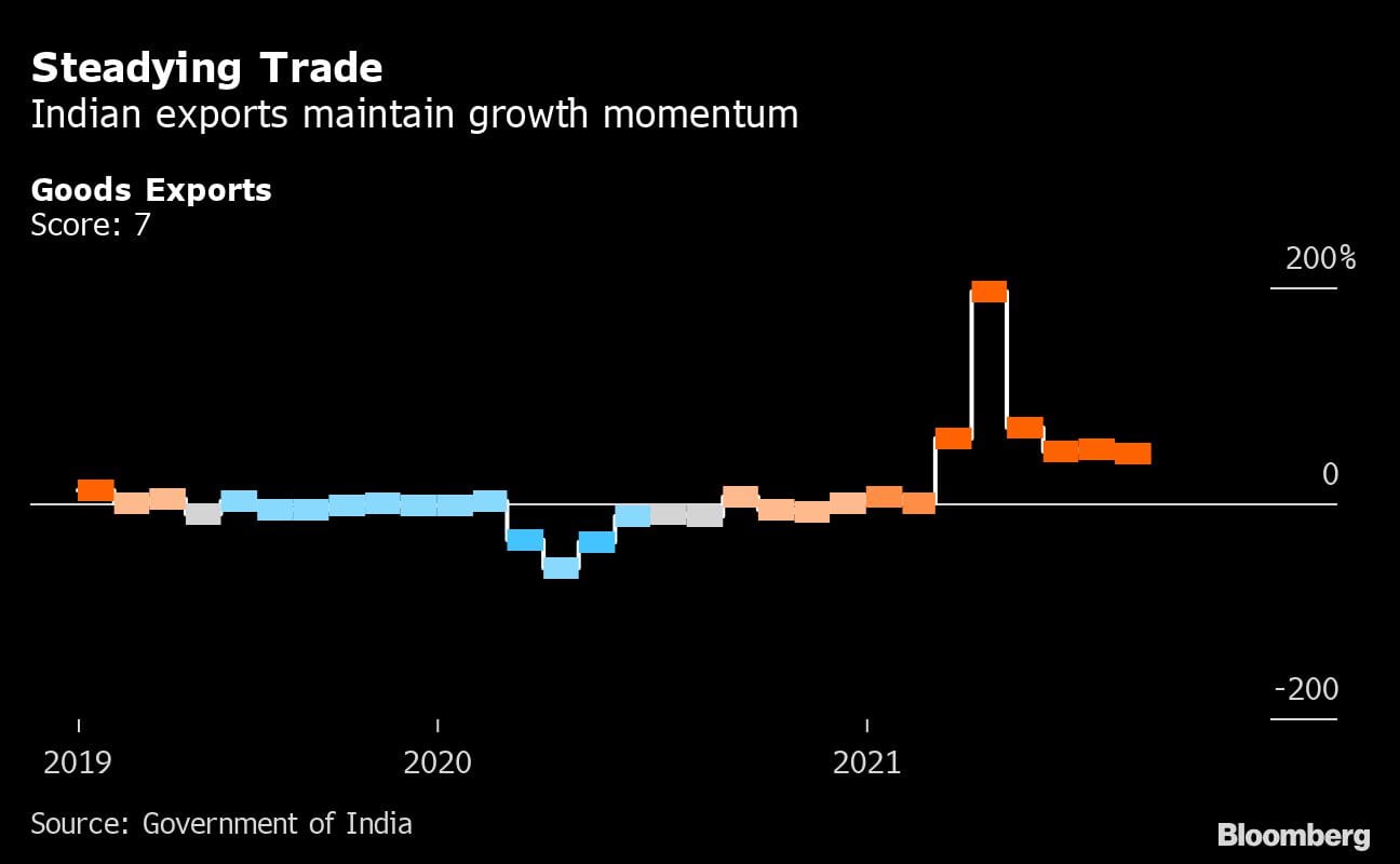 The monthly expansion in services and manufacturing activity coincided with relatively low new Covid-19 cases and a pick up in the pace of vaccinations — more than 834 million doses have been administered so far in the nation of 1.3 billion people. That said, less than a fifth of the population is fully vaccinated and risks of a third wave of infections persist.