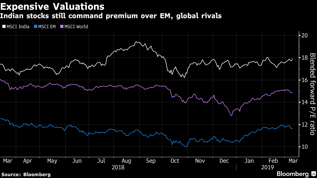 An MSCI index of Indian equities trades at a 53 percent premium compared with its emerging market rivals and is about 19 percent higher than global equities. The Indian gauge didn’t join a rally in EM and global counterparts this year, after outperforming them in 2018, mainly due to uncertainty about the composition of the next government to be formed after national elections in April and May.