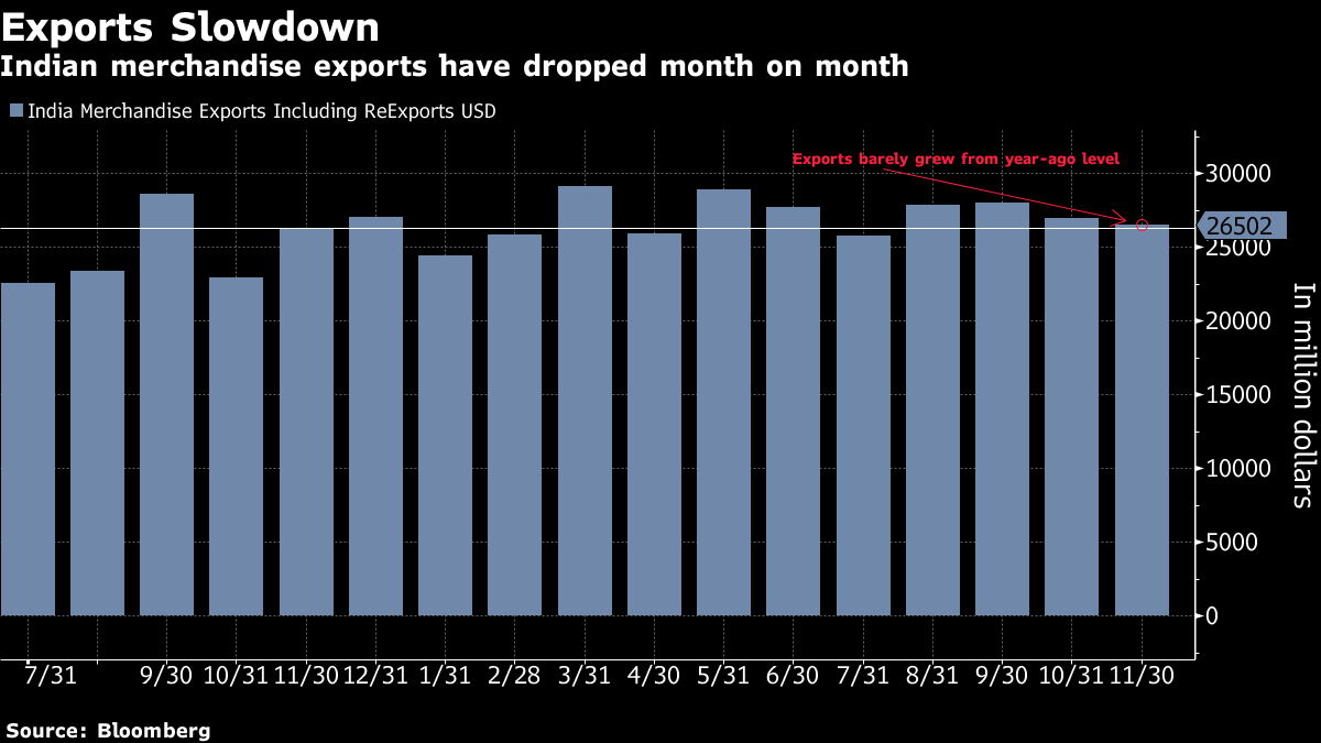 Exports in November barely grew from a year ago, and posted a decline from October as a global slowdown started to bite. According to Aditi Nayar, an economist at ICRA Ltd, a double-digit contraction in exports of gems and jewelry and engineering goods weighed down non-oil shipments.