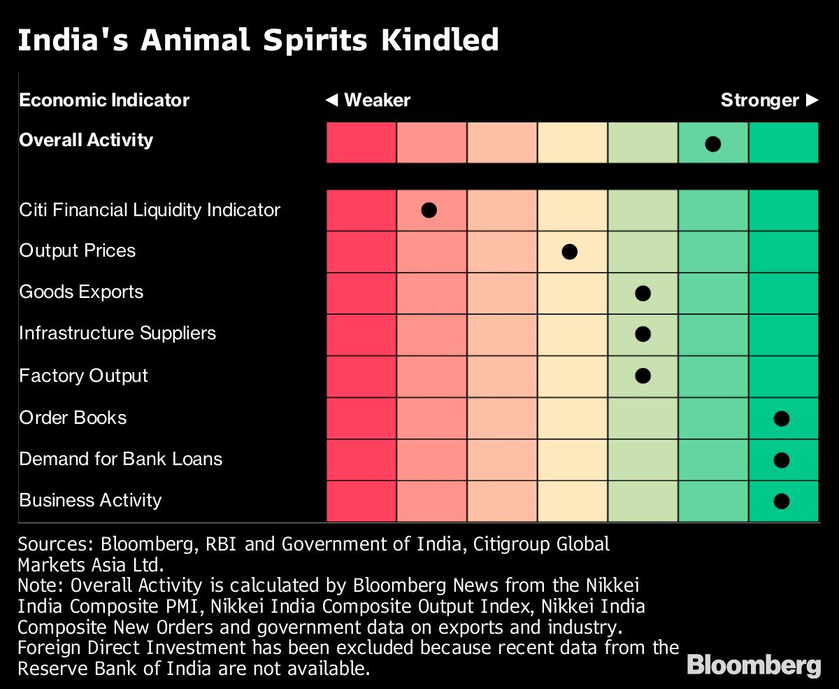 An overall activity indicator measuring ‘animal spirits’ of the Indian economy moved two notches up in November from a month ago.