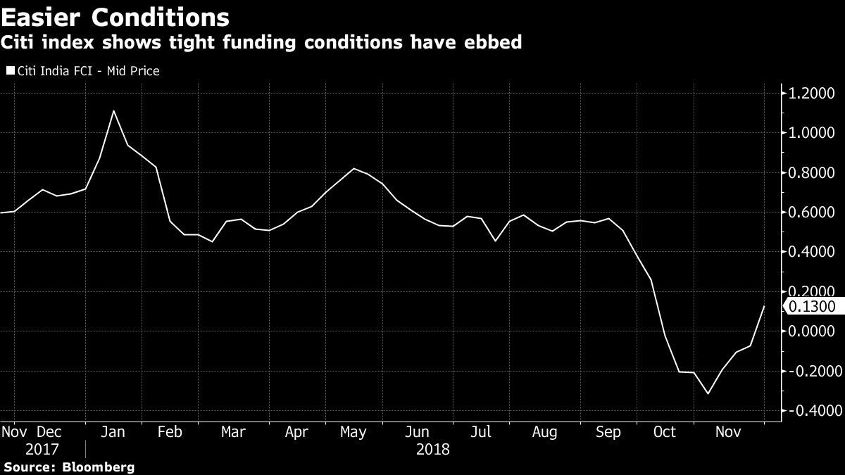 The Citi India Financial Conditions Index shows some easing in the considerable tightening of liquidity. The index includes indicators such as short-term money market rates, government bond yields, the yield curve, credit and credit default spreads.