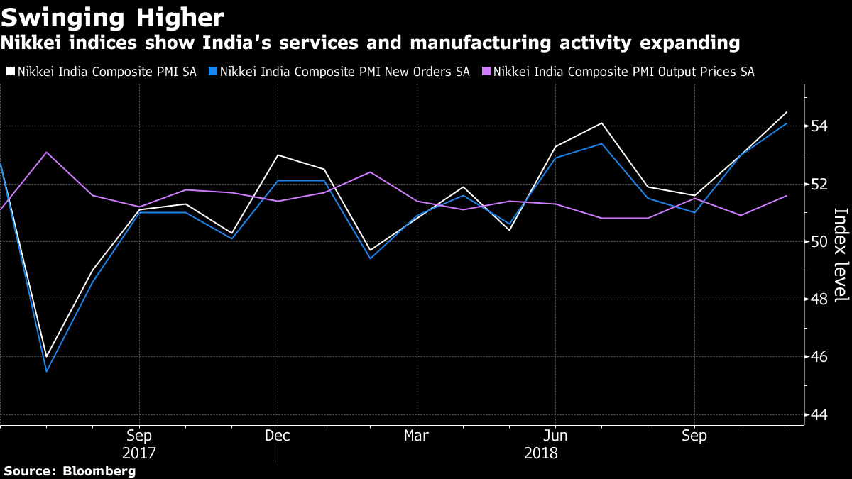 The Nikkei India Composite PMI Output Index rose to 54.5 in November from 53.0 in October, the fastest expansion in private-sector activity since October 2016. The Nikkei India services gauge rose to the strongest since July, with firms highlighting greater client numbers, favorable market conditions and sales growth.