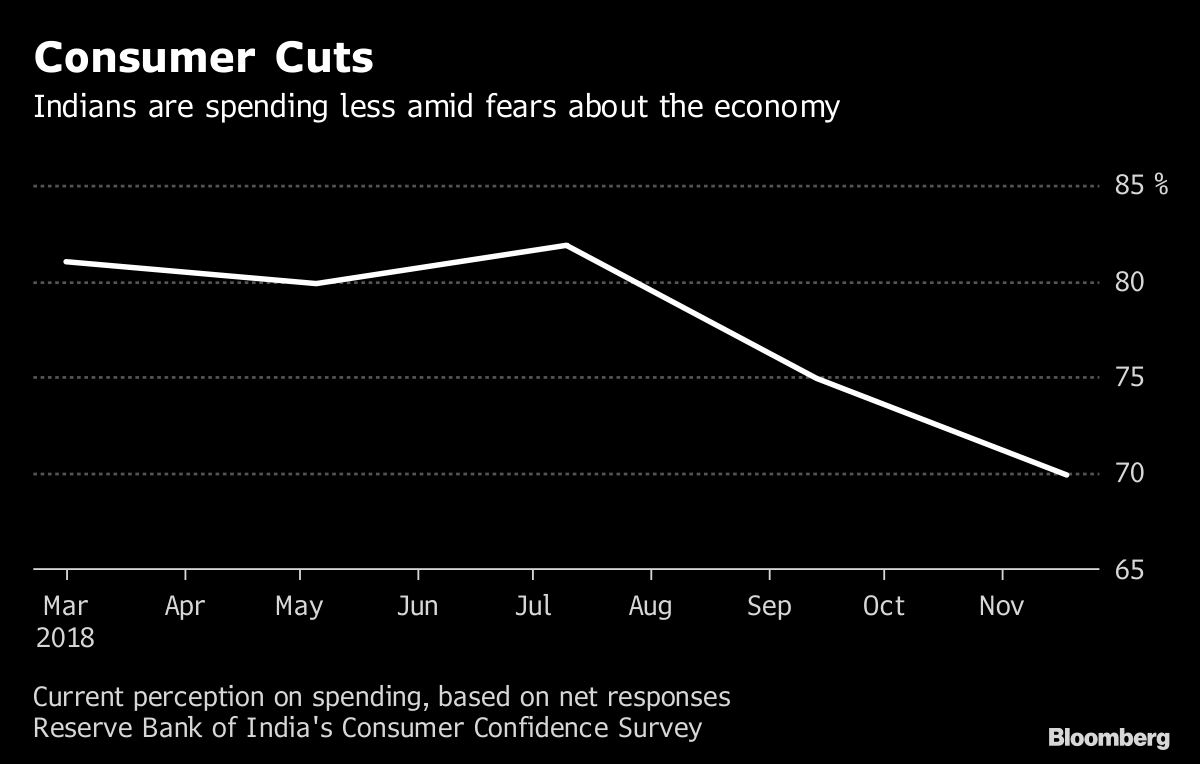 A survey from the Reserve Bank of India this month showed consumer sentiment has taken a knock on the back of increasing worries about the economy and rising concerns about jobs. The Consumer Confidence Index dropped to 93.9 in the latest gauge from 94.8 in September, the RBI said.
