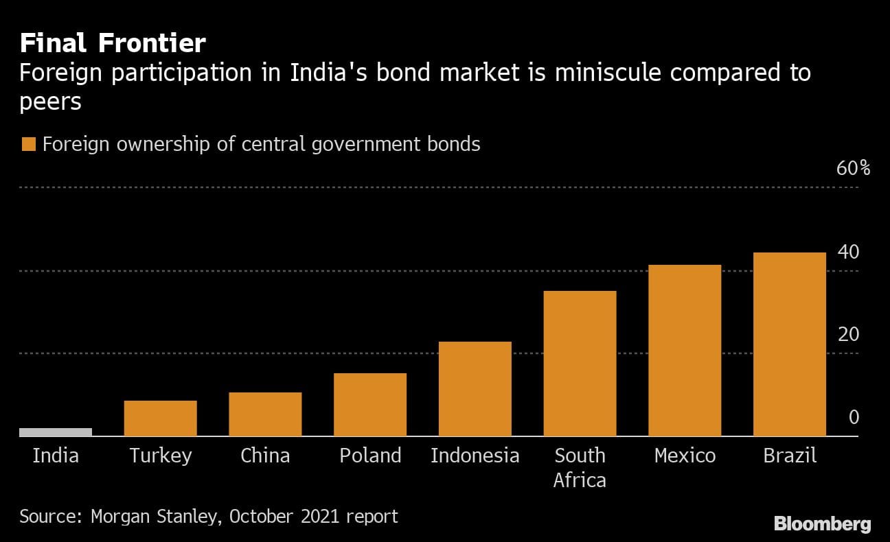 Entry into major indexes is a step change for India, which has long lagged behind peers like Brazil and South Africa in tapping global financial markets. Foreign investors hold only about 2% of all outstanding government securities and the country’s central bank has historically been averse to large debt inflows.