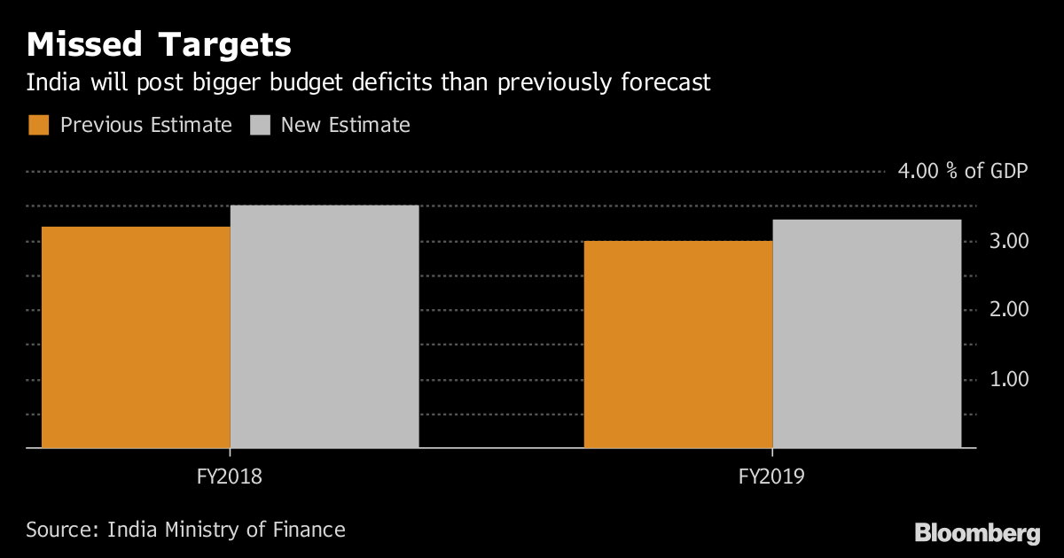 The budget was already under strain even before this weekend’s events in Karnataka — the southern state where Modi’s Bharatiya Janata Party failed to form a government. The fiscal target was breached in the 2018 financial year, while the goal for this year was widened to 3.3 percent of gross domestic product.