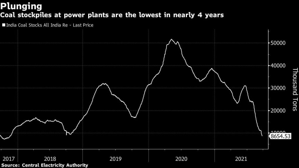 Stockpiles have fallen to the lowest since November 2017, data from the Central Electricity Authority showed. The South Asian nation isn’t alone in facing a fuel crisis. Buyers from the U.K to China are grappling with energy shortages as a rebound in demand outpaces supply.