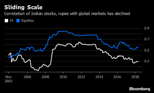 The weighted average correlation of India’s currency, bonds and stocks with those in other global economies fell to 0.32 last month, approaching a more than 10-year low of 0.29 set in November. The reading was as high as 0.68 in 2010, data compiled by . Global investment managers say this divergence provides them with an asset class that can smooth out returns in their portfolios.