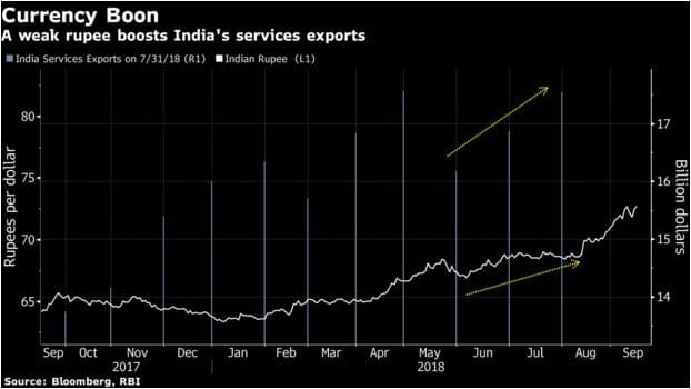The boost to services exports from a weaker currency is in contrast to overall shipments, which historically haven’t benefited much from a weaker rupee.