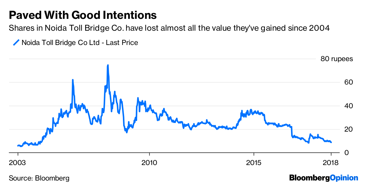 Driving on it was divine, but it soon became apparent shareholders were getting a risk-free ride at commuters’ expense, with the project guaranteeing 20 percent returns to equity investors including IL&FS. When the Delhi and Noida governments gave the land, they had expected the expressway to be returned to them in 30 years. In 2008, though, it looked like the asset was going to be in private hands for at least 70 years. In 2016, a court called out the daylight robbery and ordered the toll plazas to be dismantled. Stock of India’s first publicly traded toll road shot up above 70 rupees in 2007; it changes hands for less than 9 rupees now.