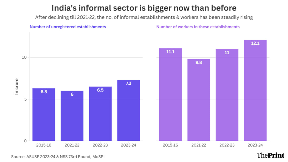 The data shows that the number of such unregistered establishments shrank from 6.3 crore in 2015-16 to 6 crore by 2021-22. Thereafter, however, the number of such informal establishments grew to 6.5 crore in 2022-23 and 7.3 crore in 2023-24.