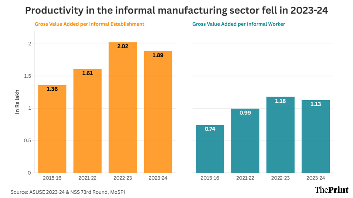 In 2023-24, however, this measure of productivity fell to Rs 1.89 lakh per informal manufacturing establishment.