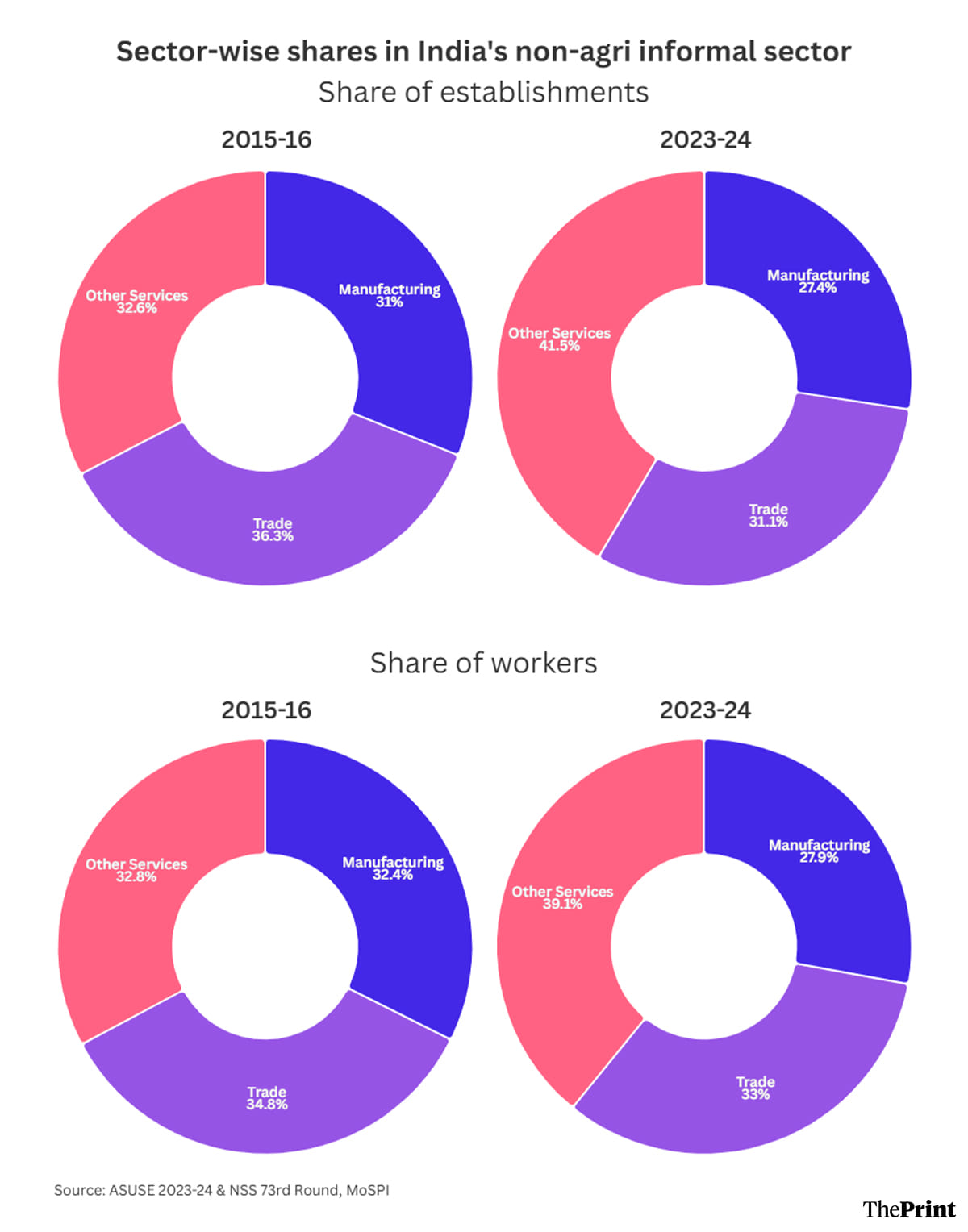 The share of the manufacturing sector in the total number of informal enterprises fell from 31 percent in 2015-16 to 27.4 percent in 2023-24. At the same time, the other services sector saw its share grow from 32.6 percent to 41.5 percent over the same period.