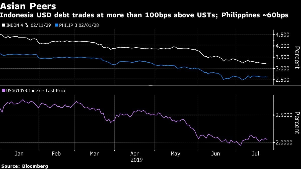 A $10 billion issuance of sovereign notes by Asia’s third-biggest economy is expected to price at a yield premium of about 90 basis points to 130 points over U.S. Treasuries, according to a Bloomberg survey of foreign and local investors. That’s in line with sales by countries with similar credit ratings such as Indonesia. The novelty of a debut offering may also support demand for India’s debt, analysts say.
