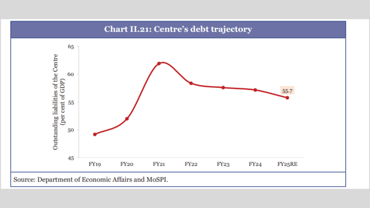 The Union government’s outstanding liabilities fell to around 55.7 percent of gross domestic product (GDP) in FY25, down from a pandemic peak of around 62 percent in FY21, revised estimates quoted in the survey said. The Centre has committed to further reducing the debt-to-GDP ratio to approximately 50 percent by FY31, with a tolerance band of one percentage point.
