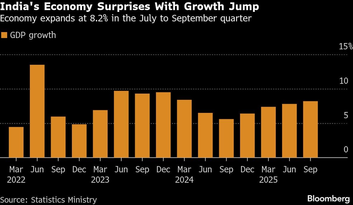 Before the GDP data, RBI Governor Sanjay Malhotra had flagged the possibility of cutting rates when the monetary panel meets later this week, citing record-low inflation. The retail price gage fell to a record 0.25% in October from a year earlier, data released last month showed.