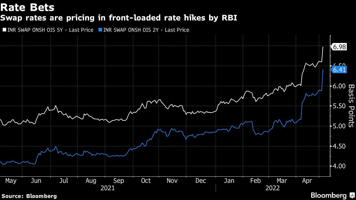 Nomura Holdings Inc. expects the Reserve Bank of India to raise its benchmark repurchase rate to 5.75% by end-December, up from its 5% forecast earlier. Barclays Plc said the RBI’s aggressive tightening has fueled expectations of a 75-point increase in the June policy, while Citigroup Inc, and DBS Group Holdings Inc. see hikes of around 100 basis points until April 2023.