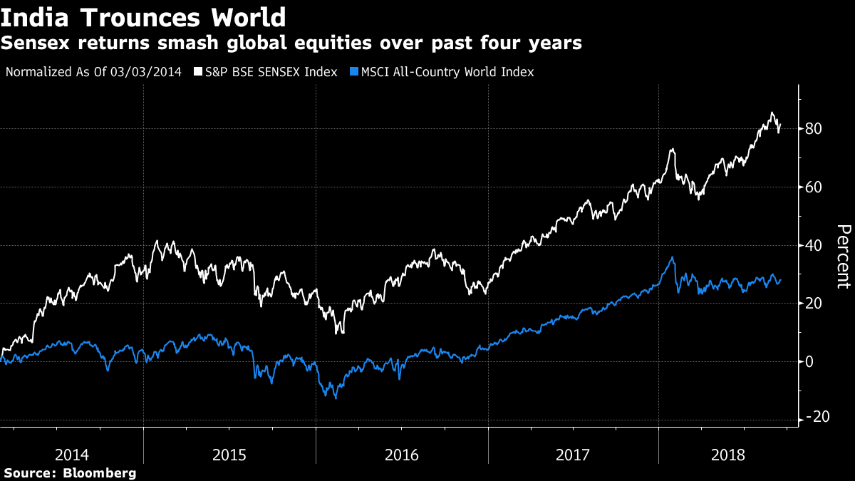 India’s world-beating economic expansion that now faces tests from higher oil prices and a tumbling rupee has accompanied the stellar run for equities, confounding non-believers in recent years. The lack of breadth among rising stocks and uncertainty going into key elections next year are now becoming common refrains for those positioning for less rosy future returns.