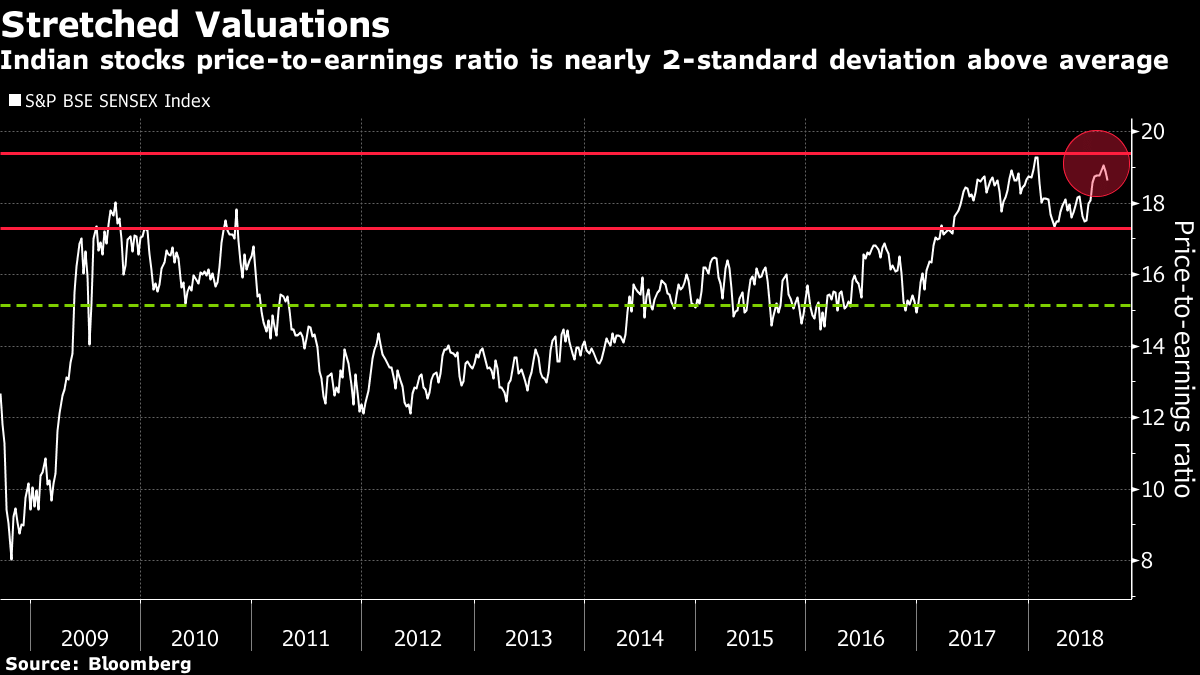The nation’s equity market looks less favorable amid elevated valuations, a potential slowdown in economic growth and upcoming elections, according to Goldman Sachs analysts, who cut India to the equivalent of a hold rating from buy. The firm has been bullish on Indian stocks since March 2014 and the market has nearly doubled since then, returning more than twice that of global equities.