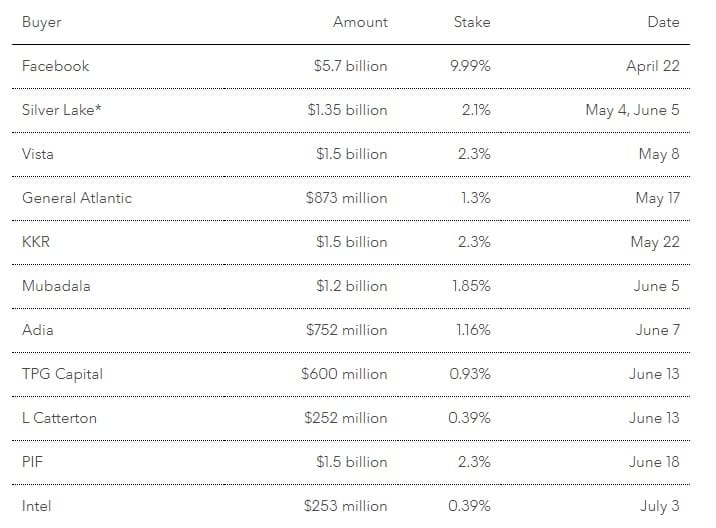 The deal is for a 0.39% share and gives the business a $65 billion equity value, Reliance said in a statement Friday.