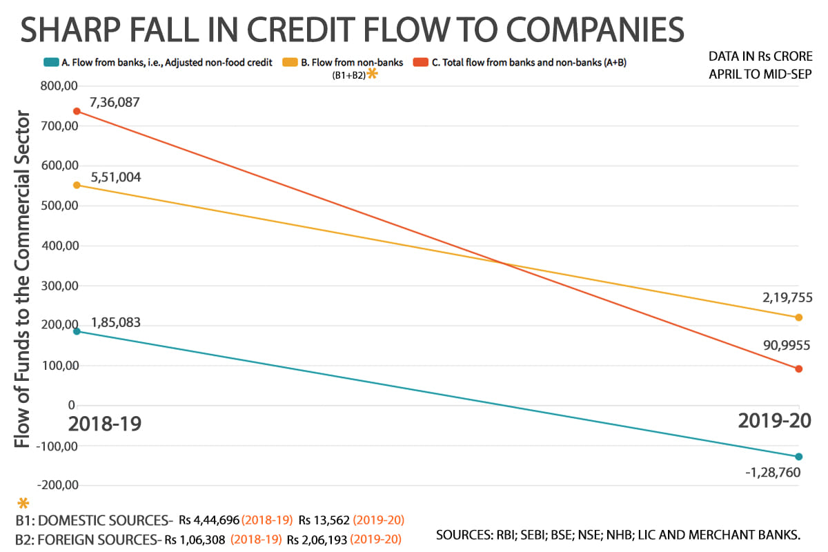 Data with the RBI shows that flow of credit to the commercial sector fell 88 per cent in the April-September period as compared to the corresponding year ago period.