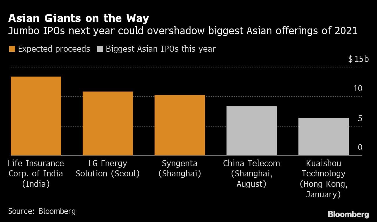 This should be the first major deal of the year. LG Energy Solution plans to raise as much as 12.75 trillion won ($10.8 billion), poised to set a record in the country. Books will open the middle of January and listing is slated for Jan. 27. Other names to watch include Hyundai Engineering & Construction Co., seeking as much as $1 billion and expected to trade in February, while the Korea Economic Daily reported Saudi Aramco-backed Hyundai Oilbank Co. aims to raise as much as $1.7 billion.