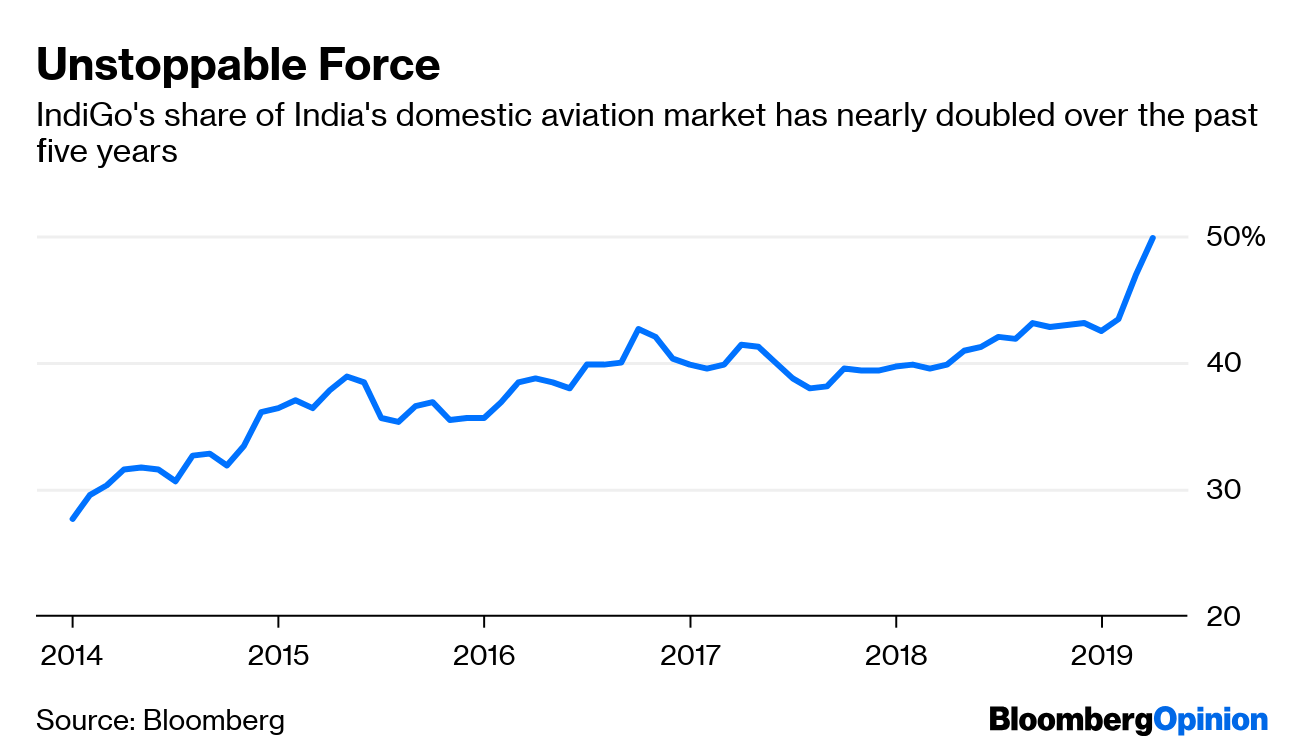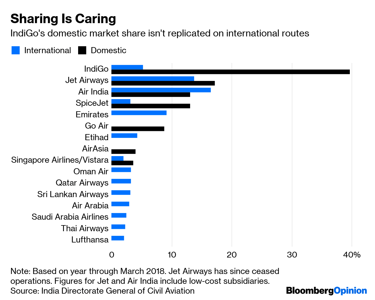 IndiGo’s fleet of single-aisle planes and no-frills services means its costs are drastically lower than the competition. Per available seat kilometer, it spent about 5.17 cents in the year through March, about a quarter less than the 6.8 cents expense at Emirates. On top of that, IndiGo’s revenue grew 13.6% in the past 12 months on international routes versus 6.2% domestically.