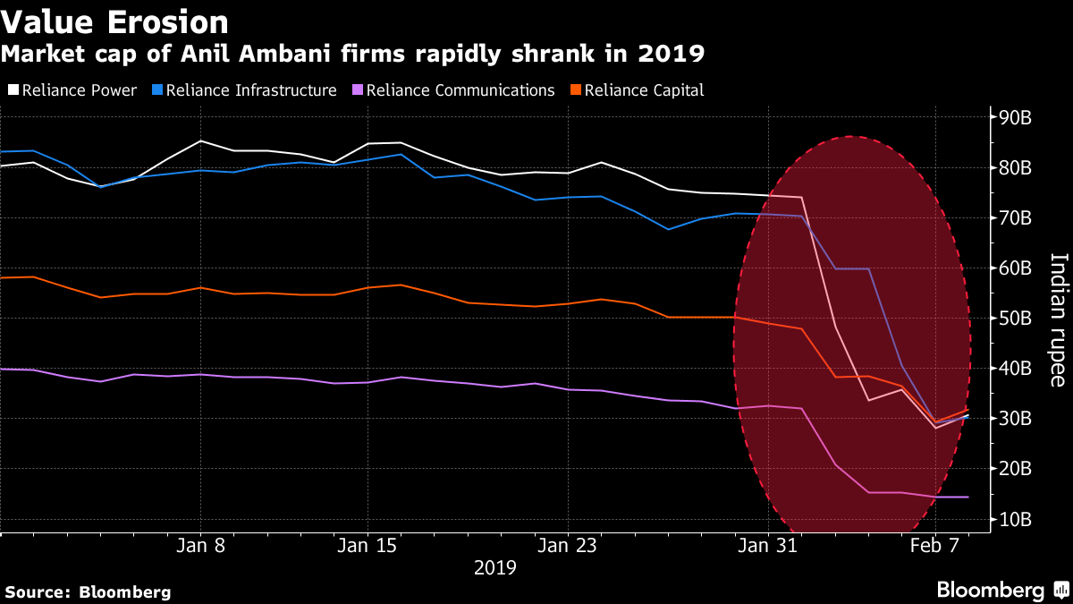 Creditors sold 5.5 billion rupees of shares in four companies — Reliance Power Ltd., Reliance Infrastructure Ltd., Reliance Communications Ltd. and Reliance Capital Ltd. — leading to a 3-to-8 percentage-point reduction in founders’ stakes in these firms, according to filings. The sale by firms including L&T Finance Ltd. and Edelweiss Group is “illegal, motivated and wholly unjustified,” the group said in a statement.