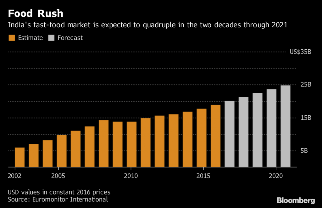 Jubilant’s profit more than tripled to 660 million rupees in the quarter ended Dec. 31 from a year earlier, helped by the Indian government’s introduction of a goods and services tax for restaurants in July, which Co-Chairman Hari Shanker Bhartia said would boost India’s organized restaurant industry at the expense of “unorganized” vendors. Hawkers and small operators combined make up the bulk of India’s fast-food market.