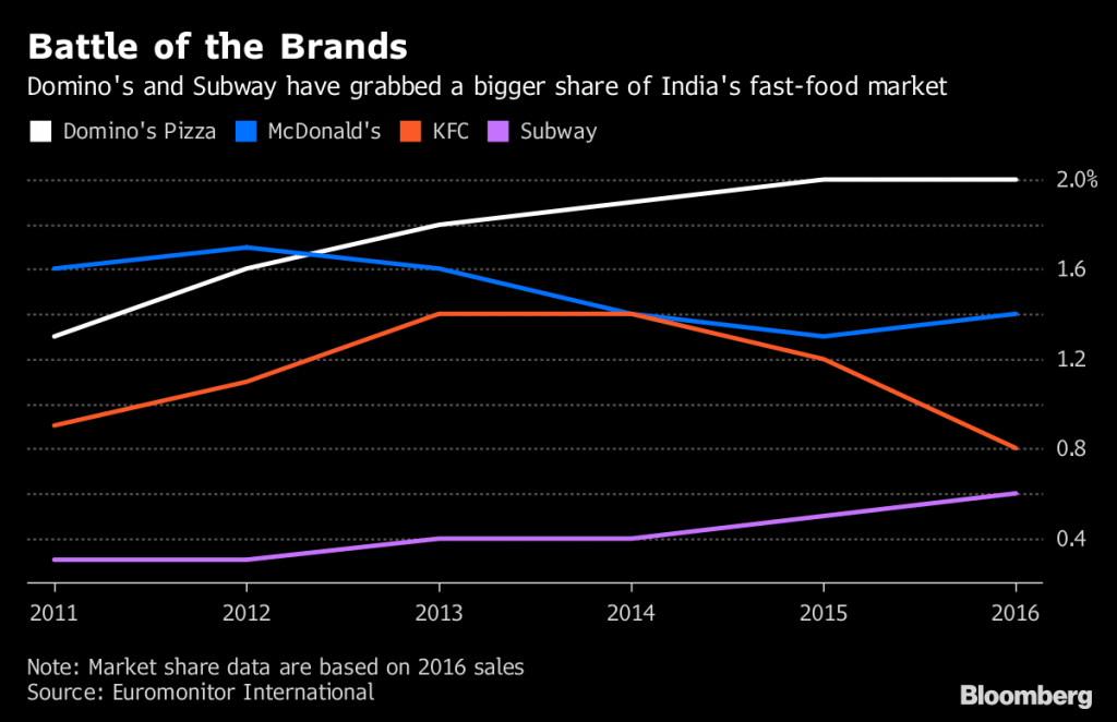 A pickup in the economy and growing demand from the planet’s largest youth population are boosting fast-food sales in India. Domino’s and Subway have gained share, eroding McDonald’s hold.