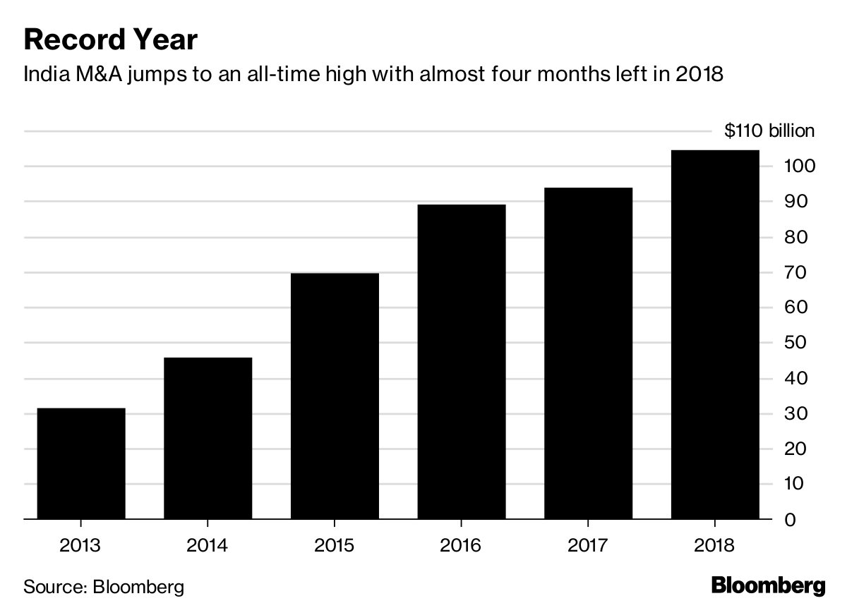 Transactions involving Indian companies have reached $104.5 billion in 2018, trouncing the previous annual record with almost four months left in the year, according to data compiled by Bloomberg. The tally may surpass $100 billion again in 2019, said Sanjeev Krishan, a Gurgaon-based partner at PwC India who focuses on private equity and deals.