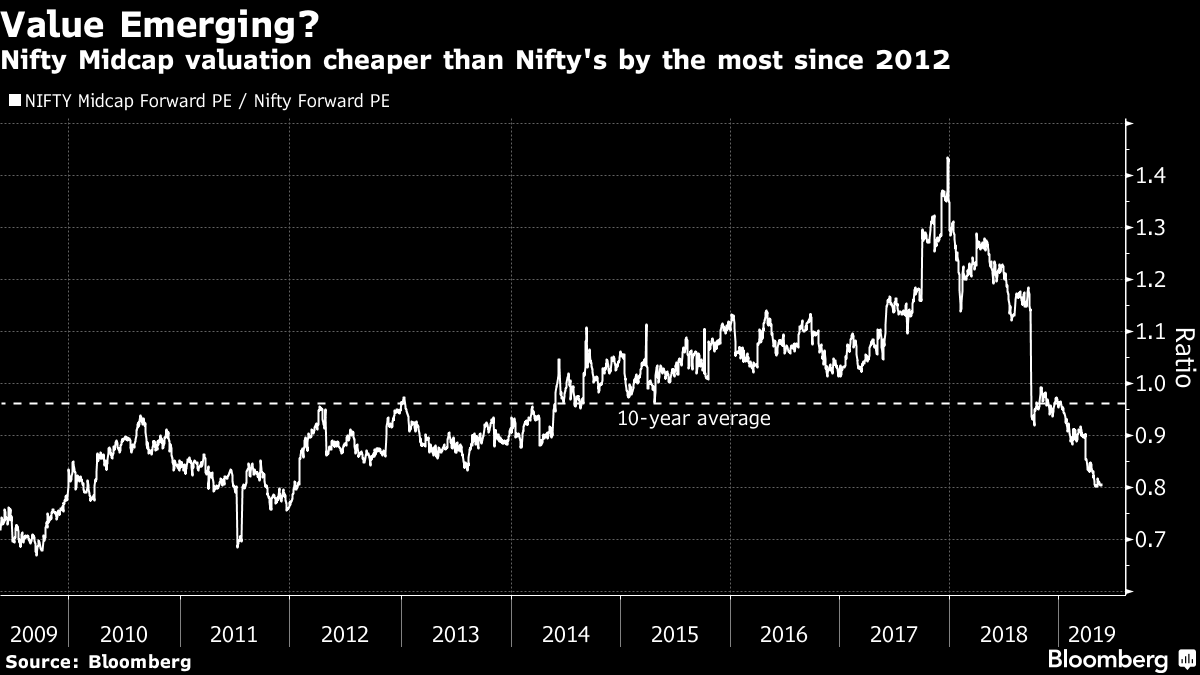 The Nifty MidCap gauge’s valuation is near the cheapest since 2012 relative to the main NSE Nifty 50 Index despite Monday’s surge. That signals potential for further gains in case of a favorable electoral verdict, according to analysts including Sameet Chavan of Mumbai-based Angel Broking Ltd.