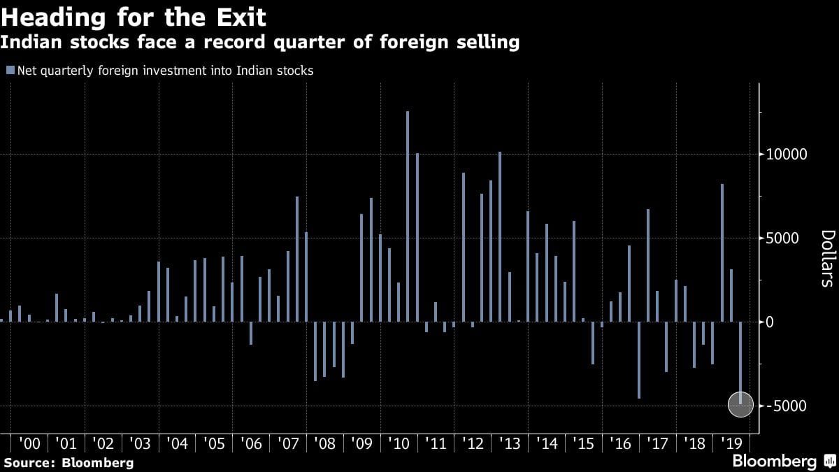 After pouring $45 billion into India’s stock market over the past six years on hopes that Modi would unleash the country’s economic potential, international money managers are now unwinding those wagers at the fastest pace on record. They’ve sold $4.5 billion of Indian shares since June, on course for the biggest quarterly exodus since at least 1999.