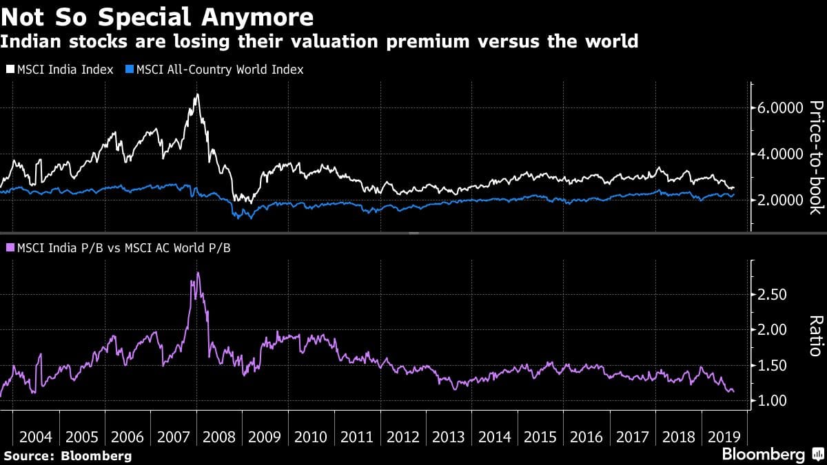 The MSCI India Index has dropped 9% from its all-time high in August 2018, cutting the gauge’s longstanding valuation premium over the MSCI All-Country World Index to the narrowest level since 2004. The Indian gauge now has a price-to-book ratio of 2.5, or 13% higher than the global measure. When Modi entered office, the premium was nearly 30%.