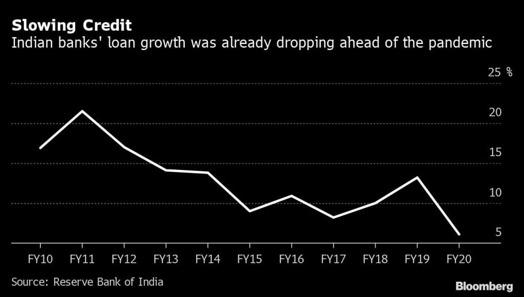 A legacy of bad loans, a shadow banking implosion and a historic bank bailout in March have left Indian lenders weakened coming into the lockdown, which has stalled the economy and pushed joblessness to 27%. Credit growth may slow to a multi-decade low of 2% to 3% in the year to March 2021, from 6% a year earlier, according to CRISIL Ltd., the local arm of S&P Global Ratings.