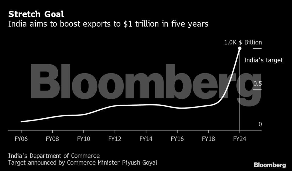 Achieving that export goal is key to making India a $5 trillion economy, Commerce Minister Piyush Goyal said in New Delhi on Thursday. The South Asian nation’s exports totaled $330 billion in the year ended March, in comparison to China’s $2.6 trillion in 2018.