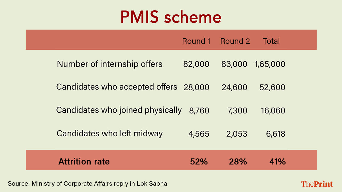 New Delhi: A little over a year after it was launched, the Modi government’s flagship Prime Minister Internship Scheme (PMIS) to skill one crore youth in the next five years is seeing an extremely lacklustre response—low acceptance and high attrition—from candidates.