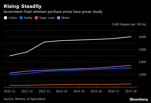 His government is seeking to pay farmers at least 50 percent more than the cost of their produce, boosting the retail prices of about a dozen monsoon-sown crops, due for harvest in October. Details of the initiative, which was first announced in the February budget, are expected soon.