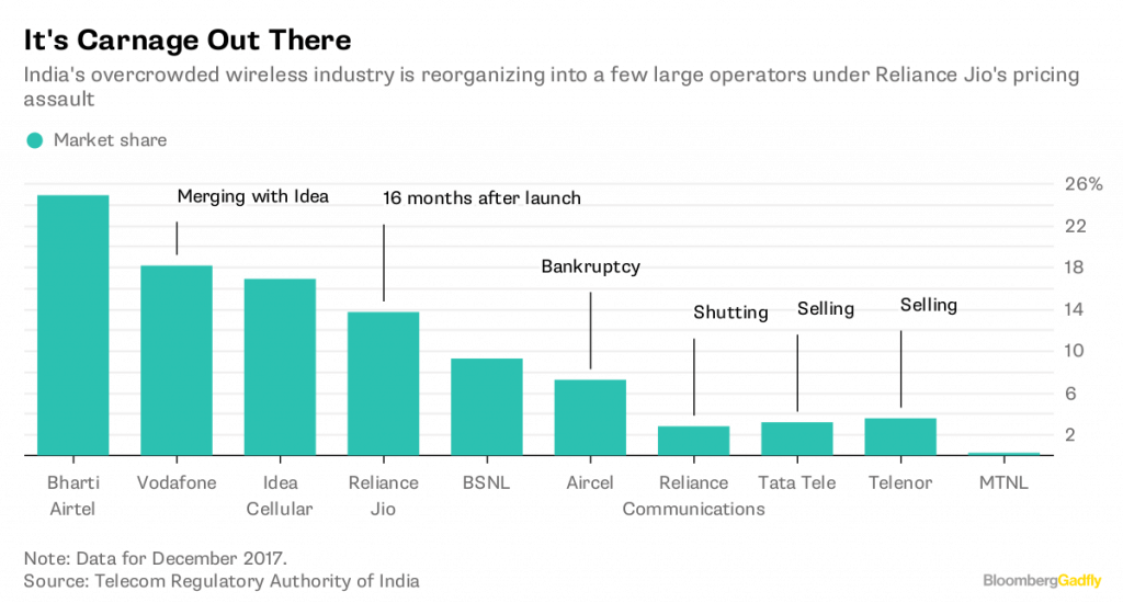 India’s telecom industry has been ripe for disruption ever since the country’s Supreme Court canceled 122 licences in 2012. But Bharti, Vodafone and Idea had no interest in upsetting their well-laden apple carts, and the Tata Group meekly ran away from its own war.