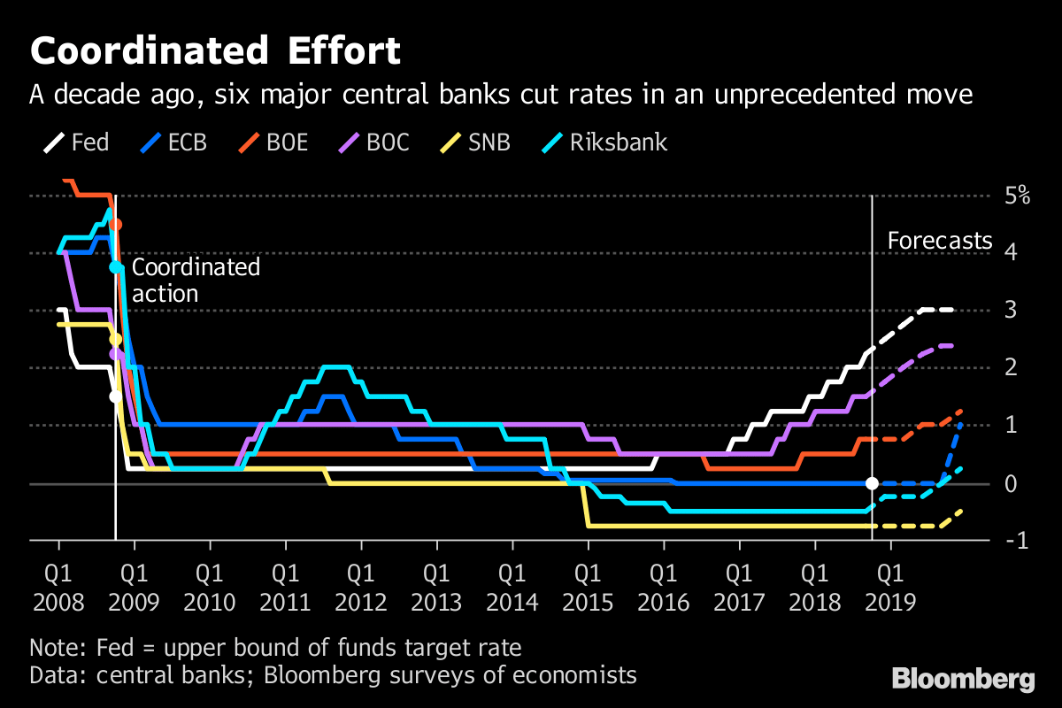It was ten years ago on Monday that the Federal Reserve and five fellow central banks banded together for a rare coordinated interest rate cut. They went on to deploy massive monetary stimulus as the global economy spiraled lower.