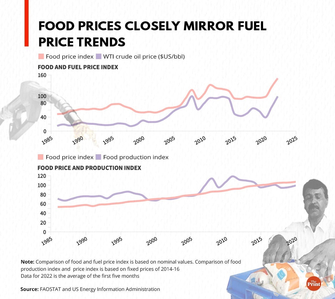 The supply disruption brought about by the Ukraine war only partly explains the surge in global food prices. Historically, global food prices closely mirror trends in energy prices, particularly crude oil.